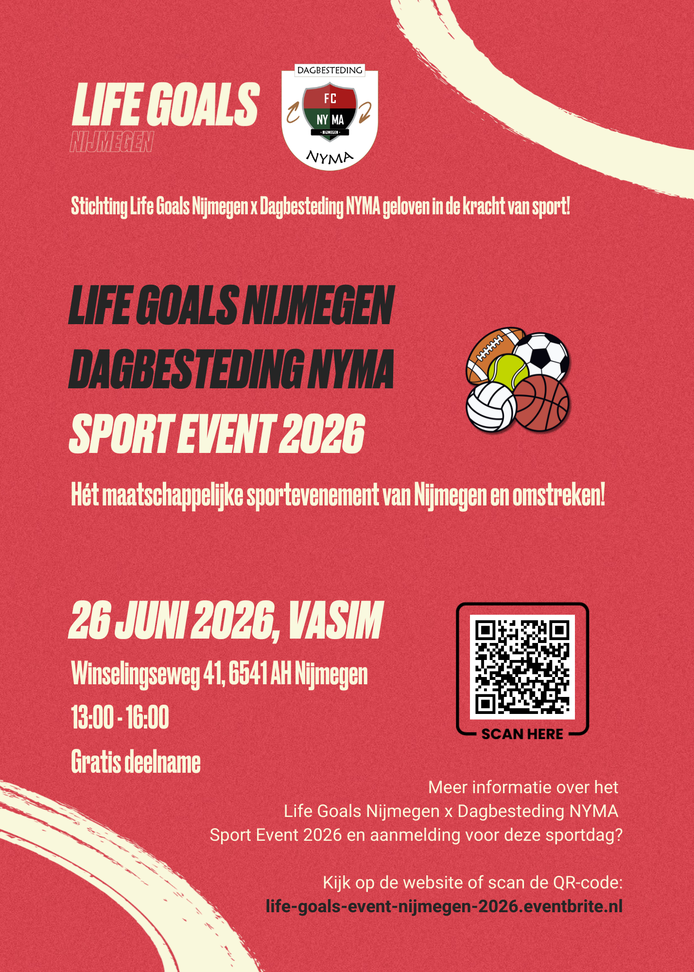 Op 26 juni organiseren Stichting Life Goals Nijmegen en Dagbesteding NYMA samen Sport Event 2026. Dit maatschappelijke sportevenement is bedoeld voor volwassen deelnemers van zorg- en welzijnsinstellingen uit de regio Nijmegen, waaronder de RIBW, en voor deelnemers van andere Life Goals-teams.
